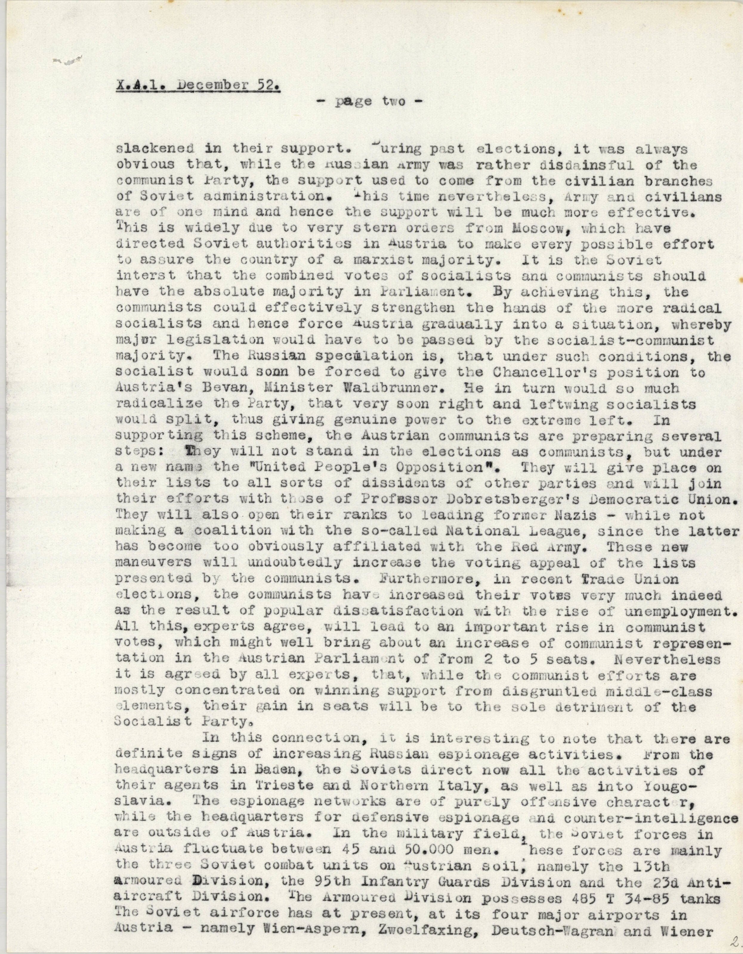 Xsdole Vecember 526 - page two = slackened in their support. “uring past elections, it was always obvious that, while the nussian army was rather disdainsful of the communist Farty, the support used to come from the civilian branches of Soviet administration, this time nevertheless, Army and civilians are of one mind and hence the support will be much more effective. This is widely due to very stern orders from Moscow, which have directed Soviet authoritics in 4ustria to make every possible effort to assure the country of a marxist majority. I1t is the Soviet interst that the combined votes of socialists and communists should ‘ have the absolute majority in Farlianent. By achieving this, the communists could effectively strengthen the hands of the more radical Socialists and hence force 4ustria gradually into a situation, whereby major legislation would have to be passed by the socialist-communist majority. The Russian spec@lation is, that under such conditions, the Socialist would sonn be forced to give the Chancellor's position to Austria's Bevan, Minister Waldbrunner. He in turn would so much radicalize the Party, that very soon right and leftwing socialists would Split, thus giving genuine power to the extreme Left. In supporting this scheme, the Austrian communists are preparing several steps: They will not stand in the elections as communists, but under anew name the "United People's Opposition™®,. They will give place on their lists to all sorts of dissidents of other parties and will join their efforts with those of Professor Dobretsberger's Democratic Union. They will also. open their ranks to leading former Nazis - while not making a coalition with the so-called National League, since the latter has become too obviously affiliated with the Red army. These new maneuvers will undoubtedly increase the voting appeal of the lists presented by the communists. Furthermore, in recent frade Union elections, the communists hav: increased their votes very much indeed as the result of popular dissatisfaction with the rise of unemployment. All this, experts agree, will iead to an important rise in communist votes, which might well bring about an increase of communist representation in the Austrian Parliament of from 2 to 5 seats. Nevertheless it is agrsed by all experts, that, while the communist efforts are mostly concentrated on winning support from disgruntled middls-class sLements, their gain in seats will be to the sole detrinent of the Socialist Farty. in this connection, it is interesting to note that there are Gefinite signs of increasing Russian espionage activities. From the headquarters in Baden, the Soviets direct now all the activities of their agents in Trieste and Northern Italy, as well as into Yougoslaviae The espionage networks are of purely offensive charact ry while the headquarters for defensive espionage and counter-intelligence are outside of austriae in the military field, the voviet forces in Austria fluctuate between 45 and 50.000 men. hese forces are mainly the three Soviet combat units on “ustrian soil; namely the 13th armoured Division, the 95th Infantry Guards Division and the 23a Antiaircraft Division. ‘he Armoured Vivision possesses 485 T 34-85 tanks The Soviet airforce has at present, at its four major airports in Austria - namely Wien-aspern, Zwoelfaxing, Deutsch-Wagran and Wiener 2
