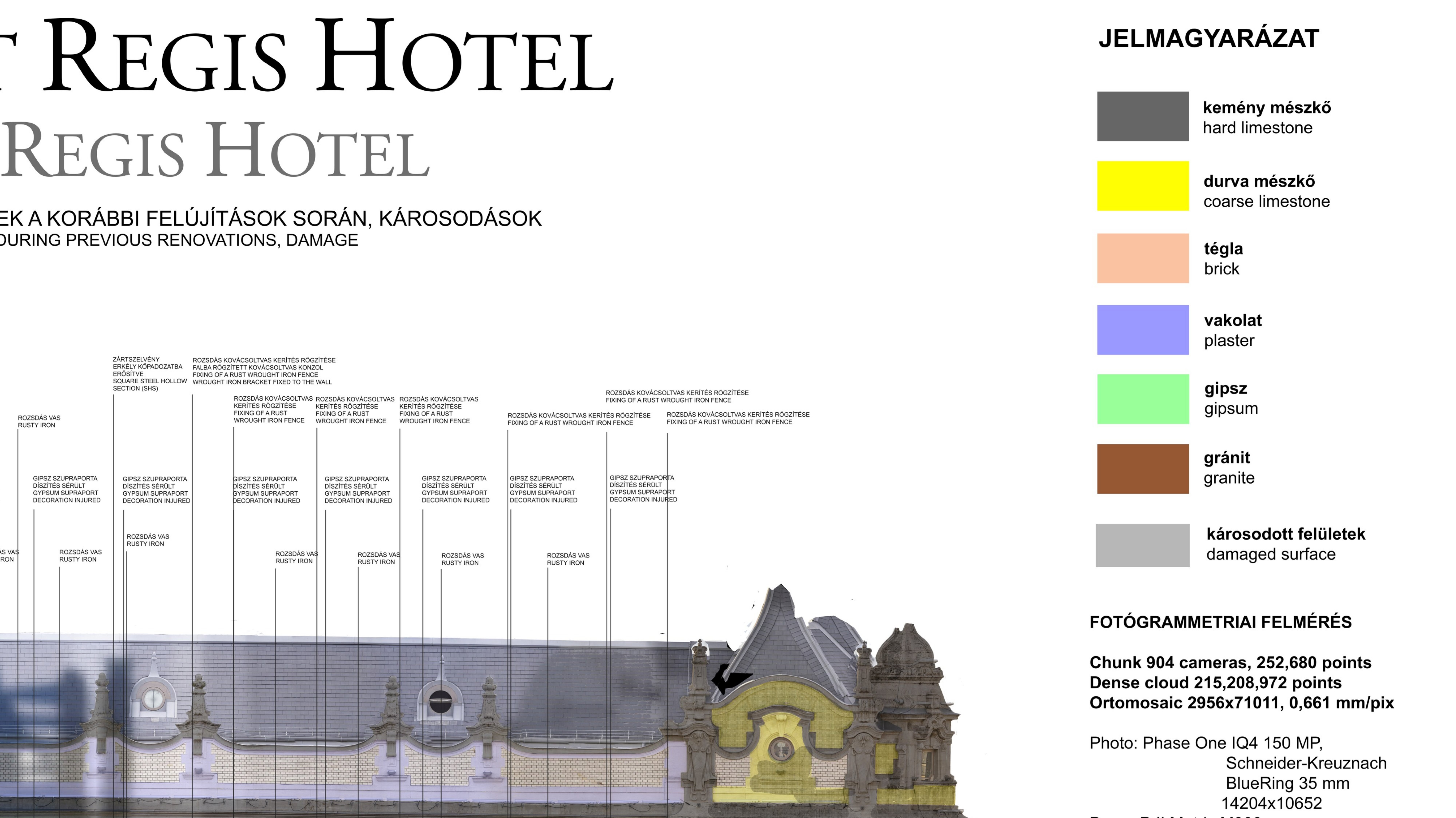 GIPSZ SZUPRAPORTA DÍSZÍTÉS SÉRÜLT GYPSUM SUPRAPORT DECORATION INJURED ROZSDÁS VAS RUSTY IRON ZARTSZELVENY ERKELY KOPADOZATBA EROSITVE SECTION (SHS) GIPSZ SZUPRAPORTA DISZITES SERULT GYPSUM SUPRAPORT DECORATION INJURED ROZSDAS VAS RUSTY IRON HH FIXING OF ARUST BIPSZ SZUPRAPORTA DÍSZÍTÉS SÉRÜLT GYPSUM SUPRAPORT DECORATION INJURED ROZSDÁS VAS RUSTY IRON GIPSZ SZUPRAPORTA DÍSZÍTÉS SÉRÜLT GYPSUM SUPRAPORT DECORATION INJURED ROZSDÁS VAS RUSTY IRON GIPSZ SZUPRAPORTA DÍSZÍTÉS SÉRÜLT GYPSUM SUPRAPORT DECORATION INJURED ROZSDÁS VAS RUSTY IRON tH ROZSDAS KOVACSOLTVAS KERITES ROGZITESE FIXING OF ARUST WROUGHT IRON FENCE GIPSZ SZUPRAPORTA DÍSZÍTÉS SÉRÜLT GYPSUM SUPRAPORT DECORATION INJURED ROZSDÁS VAS RUSTY IRON FIXING OF A RUST WROUGHT IRON FENCE GIPSZ SZUPRAPORJTA DÍSZÍTÉS SÉRÜLT GYPSUM SUPRAPORT DECORATION INJURED JELMAGYARÁZAT kemény mészkő hard limestone durva mészkő coarse limestone tégla brick vakolat plaster gipsz gipsum gránit granite károsodott felületek damaged surface FOTÓGRAMMETRIAI FELMÉRÉS Chunk 904 cameras, 252,680 points Dense cloud 215,208,972 points Ortomosaic 2956x71011, 0,661 mm/pix Photo: Phase One IQ4 150 MP, Schneider-Kreuznach BlueRing 35 mm 14204x10652