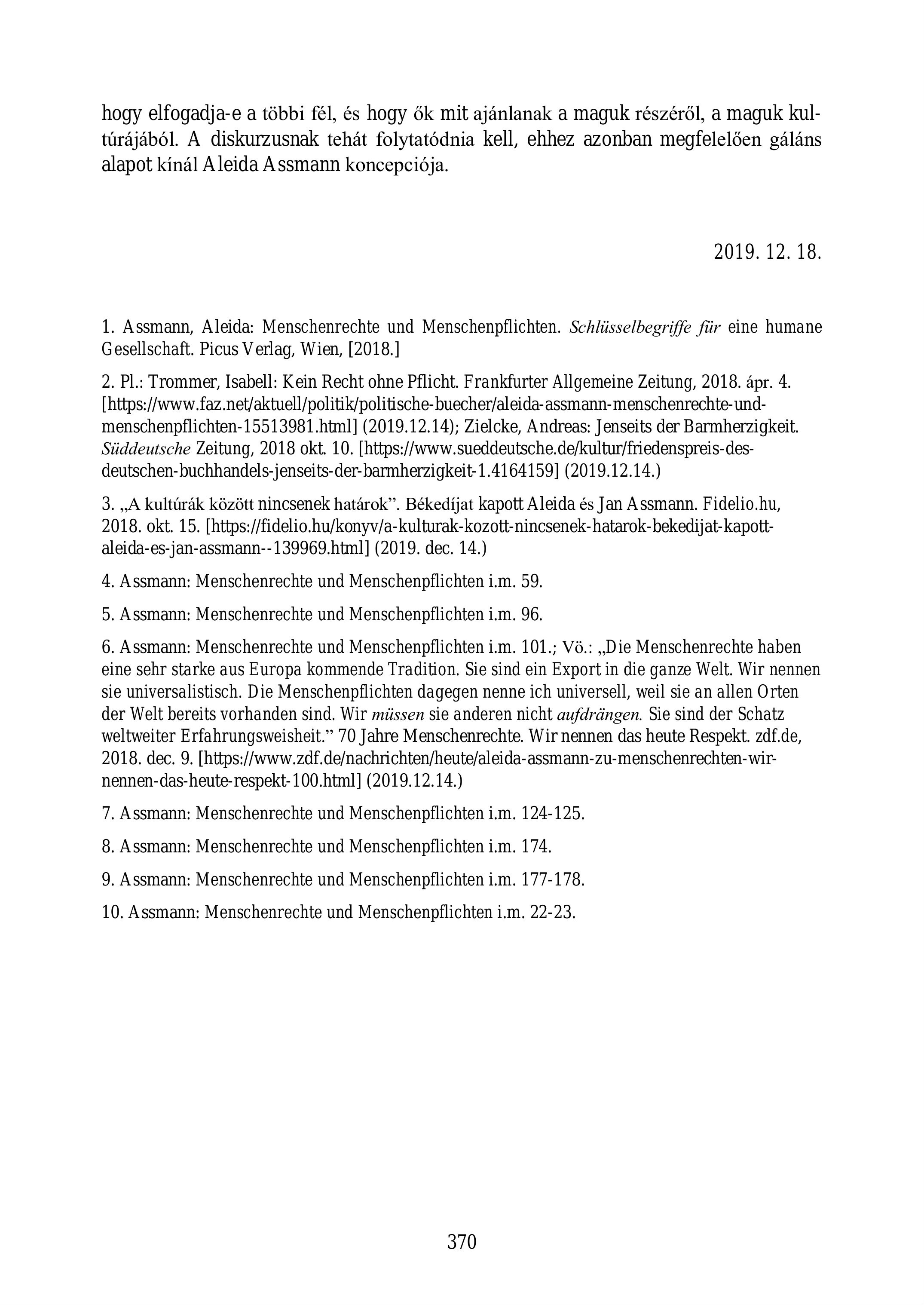 hogy elfogadja-e a többi fél, és hogy ők mit ajánlanak a maguk részéről, a maguk kultúrájából. A diskurzusnak tehát folytatódnia kell, ehhez azonban megfelelően gáláns alapot kínál A leida A ssmann koncepciója. 2019. 12. 18. 1. Assmann, Aleida: Menschenrechte und Menschenpflichten. Schlisselbegriffe für eine humane Gesellschaft. Picus Verlag, Wien, [2018.] 2. Pl.: Trommer, Isabell: Kein Recht ohne Pflicht. Frankfurter Allgemeine Zeitung, 2018. apr. 4. [https://www.faz.net/aktuell/politik/politische-buecher/aleida-assmann-menschenrechte-undmenschenpflichten-15513981.html] (2019.12.14); Zielcke, Andreas: Jenseits der Barmherzigkeit. Süddeutsche Zeitung, 2018 okt. 10. [https://www.sueddeutsche.de/kultur/friedenspreis-desdeutschen- buchhandels-jenseits-der- barmherzigkeit-1.4164159] (2019.12.14.) 3. , A kultúrák között nincsenek határok". Békedijat kapott Aleida és Jan Assmann. Fidelio.hu, 2018. okt. 15. [https://fidelio.hu/konyv/a-kulturak-kozott-nincsenek- hatarok-bekedijat-kapottaleida-es-jan-assmann--139969.html] (2019. dec. 14.) 4, Assmann: Menschenrechte und Menschenpflichten i.m. 59. 5. Assmann: Menschenrechte und Menschenpflichten i.m. 96. 6. Assmann: Menschenrechte und Menschenpflichten im. 101.; V6.: , Die Menschenrechte haben eine sehr starke aus Europa kommende Tradition. Sie sind ein Export in die ganze Welt. Wir nennen sie universalistisch. Die Menschenpflichten dagegen nenne ich universell, weil sie an allen Orten der Welt bereits vorhanden sind. Wir miissen sie anderen nicht aufdrdngen. Sie sind der Schatz weltweiter Erfahrungsweisheit.” 70 Jahre Menschenrechte. Wir nennen das heute Respekt. zdf.de, 2018. dec. 9. [https://www.zdf.de/nachrichten/heute/aleida-assmann-zu-menschenrechten-wirnennen-das-heute-respekt- 100.html] (2019.12.14.) 7. Assmann: Menschenrechte und Menschenpflichten i.m. 124-125. 8. Assmann: Menschenrechte und Menschenpflichten i.m. 174. 9. Assmann: Menschenrechte und Menschenpflichten i.m. 177-178. 10. Assmann: Menschenrechte und Menschenpflichten i.m. 22-23. 370