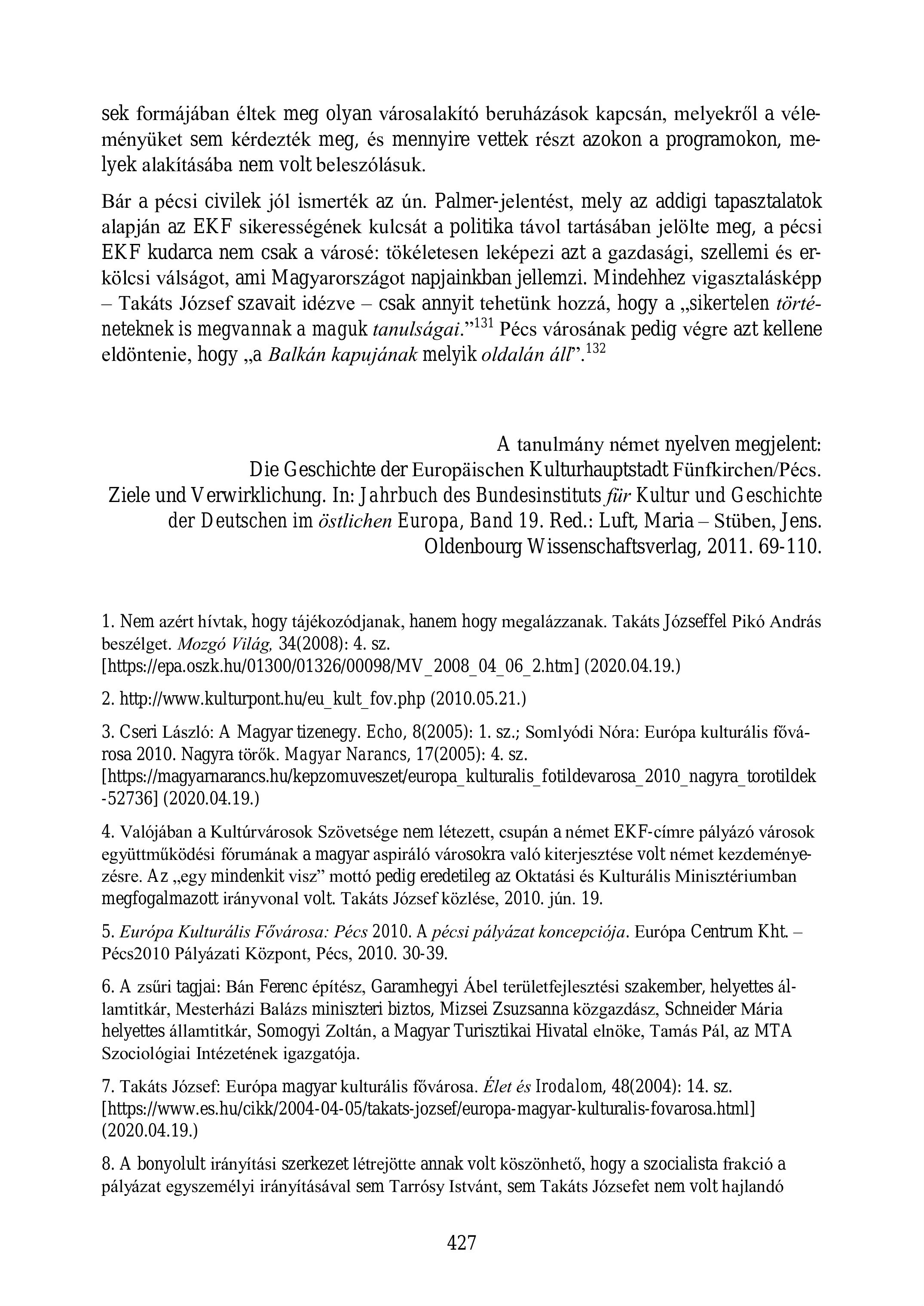 sek formájában éltek meg olyan városalakító beruházások kapcsán, melyekről a véleményüket sem kérdezték meg, és mennyire vettek részt azokon a programokon, melyek alakításába nem volt beleszólásuk. Bár a pécsi civilek jól ismerték az ún. Palmer-jelentést, mely az addigi tapasztalatok alapján az EKF sikerességének kulcsát a politika távol tartásában jelölte meg, a pécsi EKF kudarca nem csak a városé: tökéletesen leképezi azt a gazdasági, szellemi és erkölcsi válságot, ami Magyarországot napjainkban jellemzi. Mindehhez vigasztalásképp — Takáts József szavait idézve — csak annyit tehetünk hozzá, hogy a , sikertelen történeteknek is megvannak a maguk tanulságai." Pécs városának pedig végre azt kellene eldöntenie, hogy , a Balkán kapujának melyik oldalán all”? A tanulmány német nyelven megjelent: Die Geschichte der Europáischen K ulturhauptstadt Fünfkirchen/Pécs. Ziele und Verwirklichung. In: Jahrbuch des Bundesinstituts für Kultur und G eschichte der Deutschen im öszlichen Europa, Band 19. Red.: Luft, Maria — Stüben, Jens. Oldenbourg Wissenschaftsverlag, 2011. 69-110. 1. Nem azért hívtak, hogy tájékozódjanak, hanem hogy megalazzanak. Takats Józseffel Pikó Andras beszélget. Mozgó Világ, 34(2008): 4. sz. [https://epa.oszk.hu/01300/01326/00098/MV_ 2008 04 06 2.htm] (2020.04.19.) 2. http://www.kulturpont.hu/eu. kult fov.php (2010.05.21.) 3. Cseri László: A Magyar tizenegy. Echo, 8(2005): 1. sz.; Somlyódi Nóra: Európa kulturális fővárosa 2010. Nagyra törők. Magyar Narancs, 17(2005): 4. sz. [https://magyarnarancs.hu/kepzomuveszet/europa kulturalis fotildevarosa 2010 nagyra torotildek -52736] (2020.04.19.) 4. Valójában a Kultúrvárosok Szövetsége nem létezett, csupán a német EKF-címre pályázó városok együttműködési fórumának a magyar aspiráló városokra való kiterjesztése volt német kezdeményezésre. Az , egy mindenkit visz" mottó pedig eredetileg az Oktatási és Kulturális Minisztériumban megfogalmazott irányvonal volt. Takáts József közlése, 2010. jún. 19. 5. Európa Kulturális Fővárosa: Pécs 2010. A pécsi pályázat koncepciója. Európa Centrum Kht. — Pécs2010 Pályázati Központ, Pécs, 2010. 30-39. 6. A zsűri tagjai: Bán Ferenc építész, Garamhegyi Ábel területfejlesztési szakember, helyettes államtitkár, Mesterházi Balázs miniszteri biztos, Mizsei Zsuzsanna közgazdász, Schneider Mária helyettes államtitkár, Somogyi Zoltán, a Magyar Turisztikai Hivatal elnöke, Tamás Pál, az MTA Szociológiai Intézetének igazgatója. 7. Takáts József: Európa magyar kulturális fővárosa. Élet és Irodalom, 48(2004): 14. sz. [https://www.es.hu/cikk/2004-04-05/takats-jozsef/europa- magyar- kulturalis-fovarosa.html] (2020.04.19.) 8. A bonyolult irányítási szerkezet létrejötte annak volt köszönhető, hogy a szocialista frakció a pályázat egyszemélyi irányításával sem Tarrósy Istvánt, sem Takáts Józsefet nem volt hajlandó 427