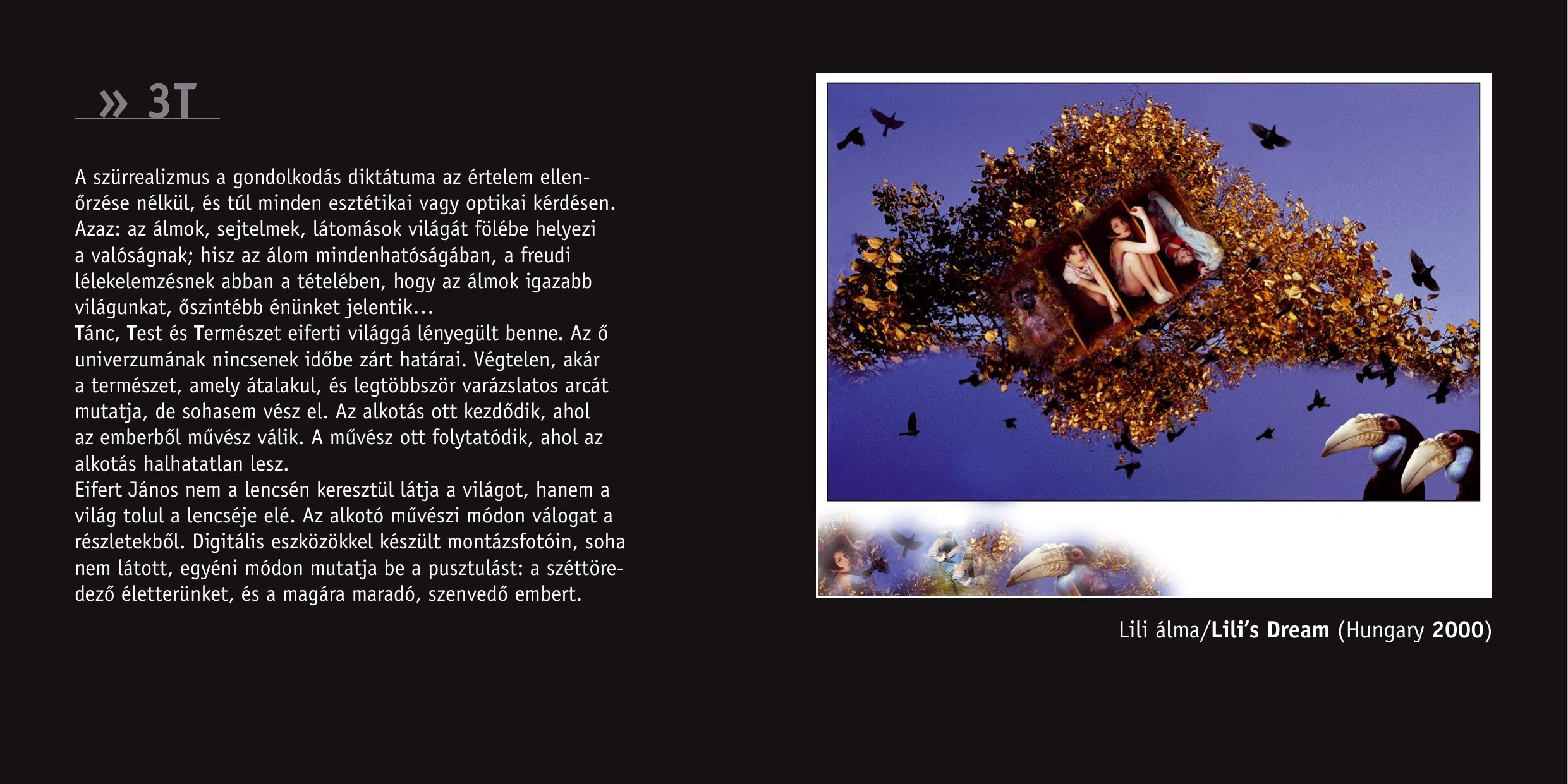 » 31 A szürrealizmus a gondolkodás diktátuma az értelem ellenőrzése nélkül, és túl minden esztétikai vagy optikai kérdésen. Azaz: az álmok, sejtelmek, látomások világát fölébe helyezi a valóságnak; hisz az álom mindenhatóságában, a freudi lélekelemzésnek abban a tételében, hogy az álmok igazabb világunkat, őszintébb énünket jelentik. . . Tánc, Test és Természet eiferti világgá lényegült benne. Az 6 univerzumának nincsenek időbe zárt határai. Végtelen, akár a természet, amely átalakul, és legtöbbször varázslatos arcát mutatja, de sohasem vész el. Az alkotás ott kezdődik, ahol az emberből művész válik. A művész ott folytatódik, ahol az alkotás halhatatlan lesz. Eifert János nem a lencsén keresztül látja a világot, hanem a világ tolul a lencséje elé. Az alkotó művészi módon válogat a részletekből. Digitális eszközökkel készült montázsfotóin, soha nem látott, egyéni módon mutatja be a pusztulást: a széttöredező életterünket, és a magára maradó, szenvedő embert.