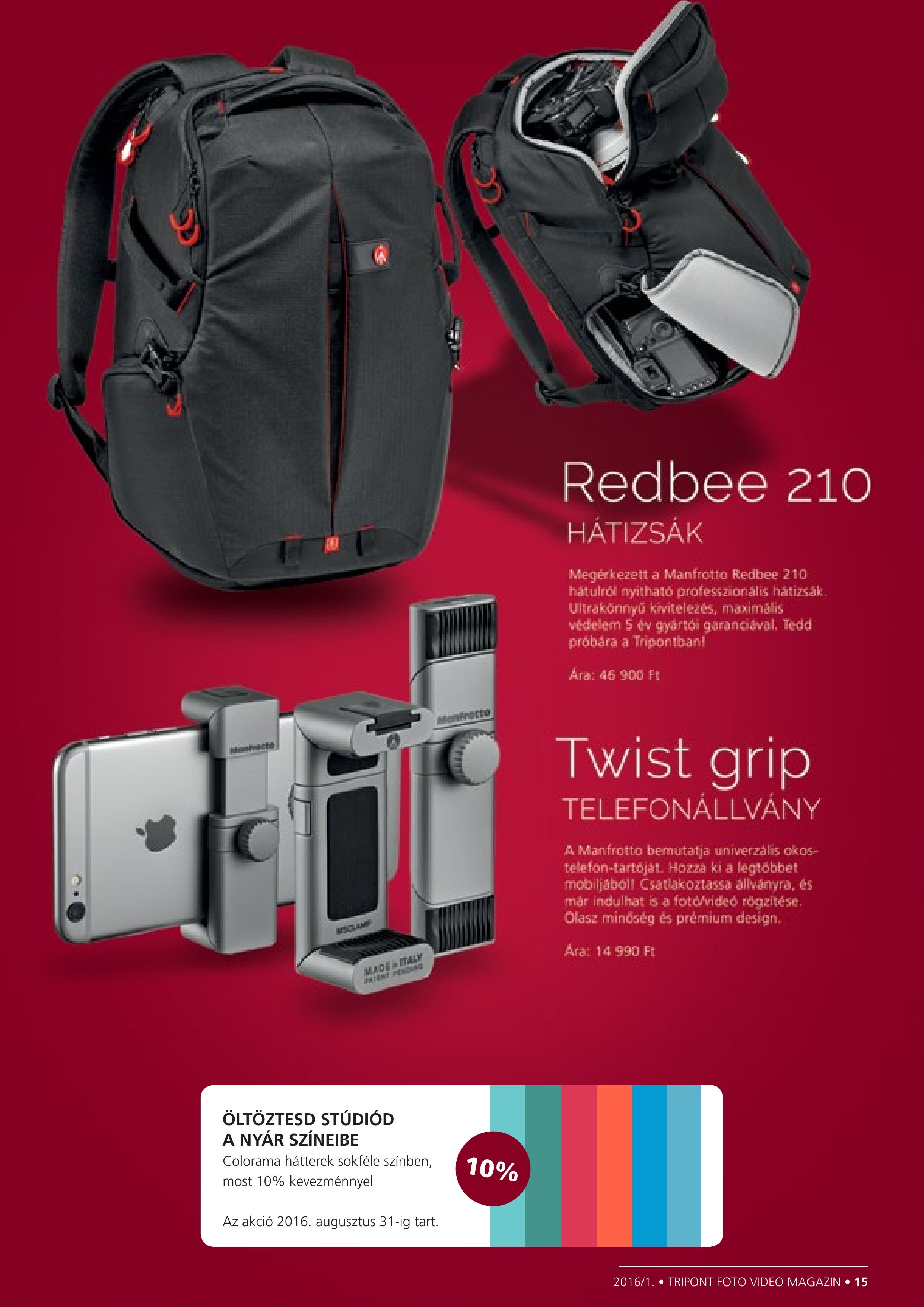 OLTOZTESD STUDIOD A NYÁR SZÍNEIBE Colorama hátterek sokféle színben, most 10% kevezménnyel Redbee 210 HATIZSAK Megérkezett a Manfrotto Redbee 210 hátulról nyiihaia öróléssztánálió hatizak. Wir onriyo kviteleres, Maximal vhielem a tv qydirice garanciával Tedd prúbára a Tiponitban! Ara: 46 900 Ft TELEFONÁLLVÁNY A Manfrotto bemutatja univerzalis akosteiefon-tartéjat. Hozza ki a légtábbet mobiljából! Csanakoztassa allvinyra, és már ingulhat 5. a iotavided reegzitese Olasz minőség és premium desig Ara: 14.990 Ft 2016/1. s TRIPONT FOTO VIDEO MAGAZIN e 15