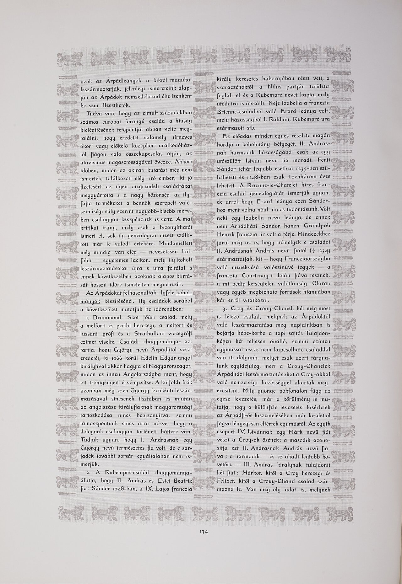 azok az Árpádleányok, a kiktől magukat       kírály keresztes háborújában részt vett, a król   leszár ják, jelenlegi k alapjan az Árpádok nemzedékrendjébe ízenként be sem illeszthetők. Tudva van, hogy az elmult századokban számos európai főrangú család a hiuság kielégítésének tetőpontját abban vélte megtalálni, hogy eredetét valamely hírneves ókori vagy előkelő középkori uralkodóháztól fiágon való összekapcsolás útján, az atavísmus magasztosságával övezze, Akkori. időben, midőn az okirati kutatást még nem ismerték, találkozott elég író ember, ki jó fizetésért az ilyen megrendelt családfákat, meggyártotta s a nagy közönség az ilyfajta termékeket a bennök szerepelt valószintiségi súly szerint nagyobb-kisebb mérv-, ben csakugyan készpénznek is vette, A mai kritikai irdny, mely csak a bizonyithatot ismeri el, sok ily genealogiai mesét szállított mar le valódi értékére. Mindamellett még mindig van elég -- nevezetesen külföldi leszármaztatásokat újra s újra feltálal s egyetemes lexikon, mely ily koholt ennek következtében azoknak alapos kiirtá  sát hosszú Az Árpádokat felhasználták ilyféle koholmányok készítésénél, Ily családok sorából őre ismételten megnehezíti. a ko őket mutatjuk 1. Drummond. Skót főúri család, mely a melforti és perthi herczegi, a melforti és lussani grófi és a Strathallani viczegrófi czímet viselte. Családi shagyományas azt be időrendben:   tartja, hogy György nevű Árpádfitól veszi eredetét, ki 1066 körül Edelin Edgár angol királyfival akkor hagyta el Magyarországot, midőn ez innen Angolországba ment, hogy off trónigényeit érvényesítse, A külföldi írók azonban még ezen György ízenkénti leszármazásával sincsenek tisztában és miután, az dsz_kirdlyfiaknal   if magyarország tartózkodása nincs bebizonyítva, semmi támaszpontunk sincs arra nézve, hogy a, dolognak csakugyan történeti háttere van. Tudjuk ugyan, hogy J. Andrásnak egy György nevű fermészetes fia volt, de e sarjadék további sorsát egyáltalában nem ísmerjük. 2. A Rubempré-család
