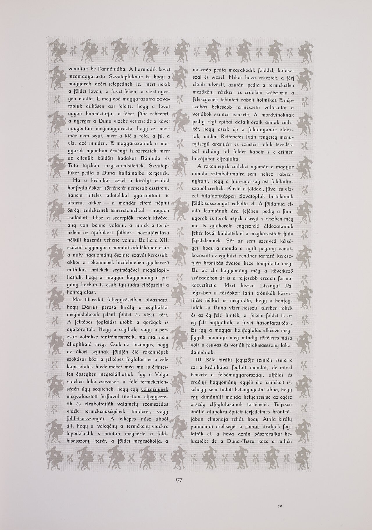 vonultak be Pannóniába. A harmadik köver megmagyarázta Szvatopluknak is, hogy a magyarok azért telepednek le, mert nekik a földet lovon, a füvet féken, a vizet nyergen eladta. E meglepő magyarázatra Szvatopluk dühösen azt felelte, hogy a lovat agyon bunkóztatja, a féket fűbe rekkenti, a nyerget a Duna vizébe vetteti; de a követ nyugodtan megmagyarázta, hogy ez most már nem segít, mert a kié a föld, a fű, a víz, azé minden. E magyarázatnak a magyarok nyomban érvényt is szereztek, mert hadakat Bánhida és megsemmisítették, Szvatopaz ellenük küldött Tata tájékán lukot pedig a Duna hullámaiba kergették. Ha a krónikás ezzel a kírályi család honfoglaláskori történetét nemcsak díszíteni, darokkal ines násznép pedig megrakodik földdel, kaldszszal és vízzel. Mikor haza érkeztek, a férj előbb üdvözli, azután pedig a terméketlen mezőkön, réteken és erdőkön szétszórja a feleségének tekintett rabolt holmikat. Enépbékésebb votjákok szintén ismerik. A mordvinoknak szokás természetű változatát a pedig régi epikai dalaik örzik annak emlékét, hogy őseik ép a földanyának áldoztak, midőn Rettenetes Iván rengeteg menynyiségű aranyért és ezüstért tőlük tévedésből néhány tál földet kapott s e czímen hazájukat elfoglalta. A rokonnépek emlékei nyomán a magyar monda szimbolumaira sem nehéz rábizonyítani, hogy a finn-ugorság ősi féldkultuszából eredtek. Kusid a földdel, fűvel és vízzel tulaj. hanem hiteles akarta, ősrégi emlékeinek ismerete nélkül gyarap akkor — a mondát éltető néphit nagyon csalódott. Hisz a szereplők neveit kívéve, alíg van benne valami, a minek a történelem az újabbkori folklore hozzájárulása nélkül hasznát vehette volna. De ha a XII. század e gyönyörű mondai adalékában csak a naiv hagyomány őszinte szavát keressük, akkor a rokonnépek hiedelmében gyökerező mithikus emlékek segítségével megállapíthatjuk, hogy a magyar hagyomány a pogány korban is csak így tudta elképzelni a honfoglalást. Már Herodot följegyzéseiben olvasható, hogy Dárius perzsa kírály a seytháktól meghódolásuk jeléiil földet és vizet kért. A jelképes foglalást utóbb a görögök is gyakorolták. Hogy a scythak, vagy a perzsák voltak-e tanitémestereik, ma mdr nem állapítható meg. Csak az bizonyos, hogy az ókori seythák földjén élő rokonnépek szokásai közt a jelképes foglalást és a vele kapcsolatos hiedelmeket még ma is érintetlen épségben megtalálhatjuk. Így a Volga vidékén lakó csuvasok a föld terméketlenségén úgy segítenek, hogy egy vőlegénynek megválasztott férfiúval titokban eljegyezte tik és elraboltatják valamely szomszédos vidék termékenységének tündérét, vagy földkisasszonyát. A jelképes nász abból áll, hogy a vőlegény a termékeny vidékre lopódzkodik s miután megkérte a földkisasszony kezét, a földet megcsókolja, a 77 Pp pi birtokának földkisasszonyát rabolta el. A földanya eladó leányának ára fejében pedig a finnugorok és török népek ősrégi s részben még ma is gyakorolt engesztelő áldozatainak fehér lovát küldötték el a megkárosított flav fejedelemnek. Sőt az sem szenved kétséget, hogy a monda e nyilt pogány vonaikozásait az egyházi rendhez tartozó keresztyén krónikás óvatos keze tompította meg. De az élő hagyomány még a következő századokon át is a teljesebb eredeti formát Mert 1692-ben a középkori latin krónikák közvey a honfogirtben tölték és az ég felé hinték, a fekete földet is az közvetítette. hiszen Lisznyai Pál títése nélkül is megtudta, ho lalók ca Duna vízét hosszú ég felé hajigálták, a fűvet hasonlatosképs. És így a magyar honfoglalás elkésve megfigyelt mondája még mindig tökéletes mása volt a csuvas és votják földkisasszony lakodalmának. W. Béla kírály jegyzője szintén ismerte ezt a krónikába foglalt mondát; de mivel alföldi és erdélyi hagyomány egyéb élő emlékeit is, ismerte a felsőmagyarországi sehogy sem fudott belenyugodni abba, hogy egy dunántúli monda helyettesítse az egész ország elfoglalásának történetét. Teljesen önálló alapokra épített terjedelmes krónikájában elmondja tehát, hogy Attila kirdly pannóniai örökségét a római királyok fog lalták el, a hova aztán pásztoraikat helyezték; de a Duna-Tisza köze a ruthén