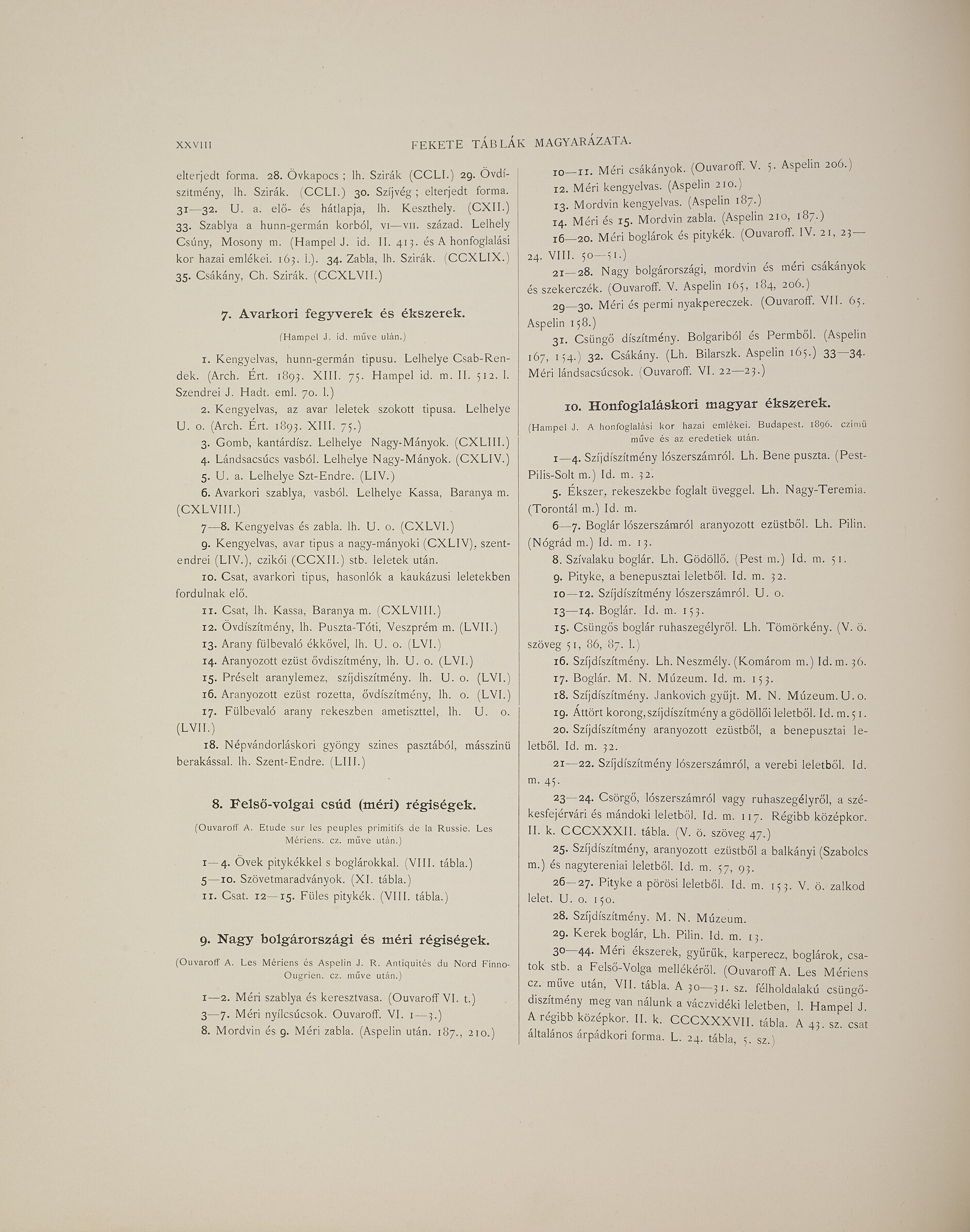XXVIII elterjedt forma. 28. Övkapocs ; lh. Szirák (CCLI.) 29. Övdíszitmény, Ih. Szirák. (CCLI.) 30. Szíjvég ; elterjedt forma. | 31—32. U. elé- és hétlapja, lh. Keszthely. (CXI1.) | 33. Szablya a hunn-germén korból, vi—vil. század. Lelhely Cstiny, Mosony m. (Hampel J. id. II. 413. és A honfoglalási kor hazai emlékei. 163. 1.). 34. Zabla, Ih. Szirák. (CCXLIX.) 35. Csákány, Ch. Szirák. (CCXLVII.) a. 7. Avarkori fegyverek és ékszerek. (Hampel J. id. műve ulán.) 1. Kengyelvas, hunn-germán tipusu. Lelhelye Csab-Rendek. (Arch. Ert. 1893. XIII. 75. Hampel id. m. II. 512. 1. Szendrei J. Hadt. eml. 7o. 1.) 2. Kengyelvas, az avar leletek szokott tipusa. Lelhelye U. @. (Airen. Ért. 1893. XIII. 75.) 3. Gomb, kantardisz. Lelhelye Nagy-Manyok. (CXLIII.) 4. Léndsacstics vasból. Lelhelye Nagy-Manyok. (CXLIV.) 5. U. a. Lelhelye Szt-Endre. (LIV.) 6. Avarkori szablya, vasból. Lelhelye Kassa, Baranya m. (CXLVIIL.) 7— 8. Kengyelvas és zabla. lh. U. o. (CXLVI.) 9. Kengyelvas, avar tipus a nagy-manyoki (CXLIV), szentendrei (LIV.), czikói (CCXII.) stb. leletek után. ro. Csat, avarkori tipus, hasonlók a kaukázusi leletekben fordulnak elő. 1. Csat, Ih. Kassa, Baranya m. (CXLVIII.) 12. Ovdiszitmény, Ih. Puszta-Téti, Veszprém m. (LVII.) 13. Arany fülbevaló ékk6vel, Ih. U. o. (LVI.) 14. Aranyozott ezüst 6vdiszitmény, lh. U. o. (LVI.) 15. Préselt aranylemez, szijdiszitmény. lh. U. o. (LVI.) 16. Aranyozott ezüst rozetta, dvdiszitmény, lh. o. (LVI.) 17. Fiilbevalé arany rekeszben ametiszttel, Ih. U. o. MENNE) 18. Népvándorláskori gyöngy szines pasztából, másszinü berakással. Ih. Szent-Endre. (LIII.) 8. Felsé-volgai cstid (méri) régiségek. (Ouvaroff A. Etude sur les peuples primitifs de la Russie. Les Mériens. cz. műve után.) 1— 4. Ovek pitykékkel s boglérokkal. (VIII. tabla.) 5—10. Sz6vetmaradvanyok. (XI. tabla.) Ir. Csat. 12—15. Füles pitykék. (VIII. tabla.) 9. Nagy bolgárországi és méri régiségek. (Ouvaroff A. Les Mériens és Aspelin J. R. Antiguités du Nord FinnoOugrien. cz. műve után.) 1—2. Méri szablya és keresztvasa. (Ouvaroff VI. t.) 3—7. Méri nyílcsúcsok. Ouvaroff. VI. 1—3.) 8. Mordvin és 9. Méri zabla. (Aspelin után. 187., 210.) ro—rr. Méri csákányok. (Ouvaroff. V. 5. Aspelin 206.) 12. Méri kengyelvas. (Aspelin 210.) 13. Mordvin kengyelvas. (Aspelin 187.) 14. Méri és 15. Mordvin zabla. (Aspelin 210, 187.) 16—20. Méri boglarok és pitykék. (Ouvaroff. IV. 21, 23— 24. VIII. 50-51.) ; 2128. Nagy bolgarorsz4gi, mordvin és méri csákányok 29—30. Méri és permi nyakpereczek. (Ouvaroff. VII. 65. Aspelin 158.) 31. Csiingd diszitmény. Bolgaribdl és Permbél. (Aspelin 167, 154.) 32. Csákány. (Lh. Bilarszk. Aspelin 165.) 33—34Méri landsacsticsok. (Ouvaroff. VI. 22—23-) x0. Honfogialaskori magyar ékszerek. (Hampel J. A honfoglalási kor hazai emlékei. Budapest. 1896. czimit műve és az eredetiek után. 1— 4. Szíjdíszítmény lószerszámról. Lh. Bene puszta. (PestPilis-Solt m.) Id. m. 32. 5. Ekszer, rekeszekbe foglalt üveggel. Lh. Nagy-Teremia. (Torontál m.) Id. m. 6—7. Boglár lószerszámról aranyozott ezüstből. Lh. Pilin. (Nógrád m.) Id. m. 13. 8. Szívalaku boglár. Lh. Gödöllő. (Pest m.) Id. m. 51. 9. Pityke, a benepusztai leletből. Id. m. 32. 10—12. Szíjdíszítmény lószerszámról. U. o. 13—I4. Boglár. Id. m. 153. 15. Csüngős boglár ruhaszegélyről. Lh. Tömörkény. (V. ö. szöveg 51, 86, 87. 1.) 16. Szíjdíszítmény. Lh. Neszmély. (Komárom m.) Id. m. 36. 17. Boglár. M. N. Múzeum. Id. m. 153. 18. Szijdiszitmény. Jankovich gyűjt. M. N. Múzeum. U. o. 19. Áttört korong, szíjdíszítmény a gödöllői leletből. Id. m. 5 1. 20. Szíjdíszítmény aranyozott ezüstből, a benepusztai leletb6l. Id. m. 32. 2122. Szijdiszitmény lószerszámról, a verebi leletből. Id. m. 45. 23-24. Csörgő, lószerszámról vagy ruhaszegélyrdl, a székesfejérvari és mandoki leletből. Id. m. 117. Régibb középkor. II. k. CCCXXXIL. tábla. (V. ö. szöveg 47.) 25. Szíjdíszítmény, aranyozott ezüstből a balkányi (Szabolcs m.) és nagytereniai leletből. Id. m. 577a Do 26— 27. Pityke a pörösi leletből. Id. m. 153. V. 6. zalkod lelet. U. 0. 150. 28. Szijdiszitmény. M. N. Múzeum. 2g. Kerek boglar, Lh. Pilin. Id. m. Pe 30—44. Méri ékszerek, gyűrűk, karperecz, boglarok, csatok stb. a Felsé-Volga mellékéről. (Ouvaroff A. Les Mériens ez. ime után, VII. tábla. A 30—31. sz. félholdalakú csüngőclsalinsay meg van nálunk a vaczvidéki leletben, 1. Hampel J. A régibb középkor. II. k. CCCXXXVII. tábla. A 43. sz. csat általános árpádkori forma. L. 24. tabla, 5. sz.)