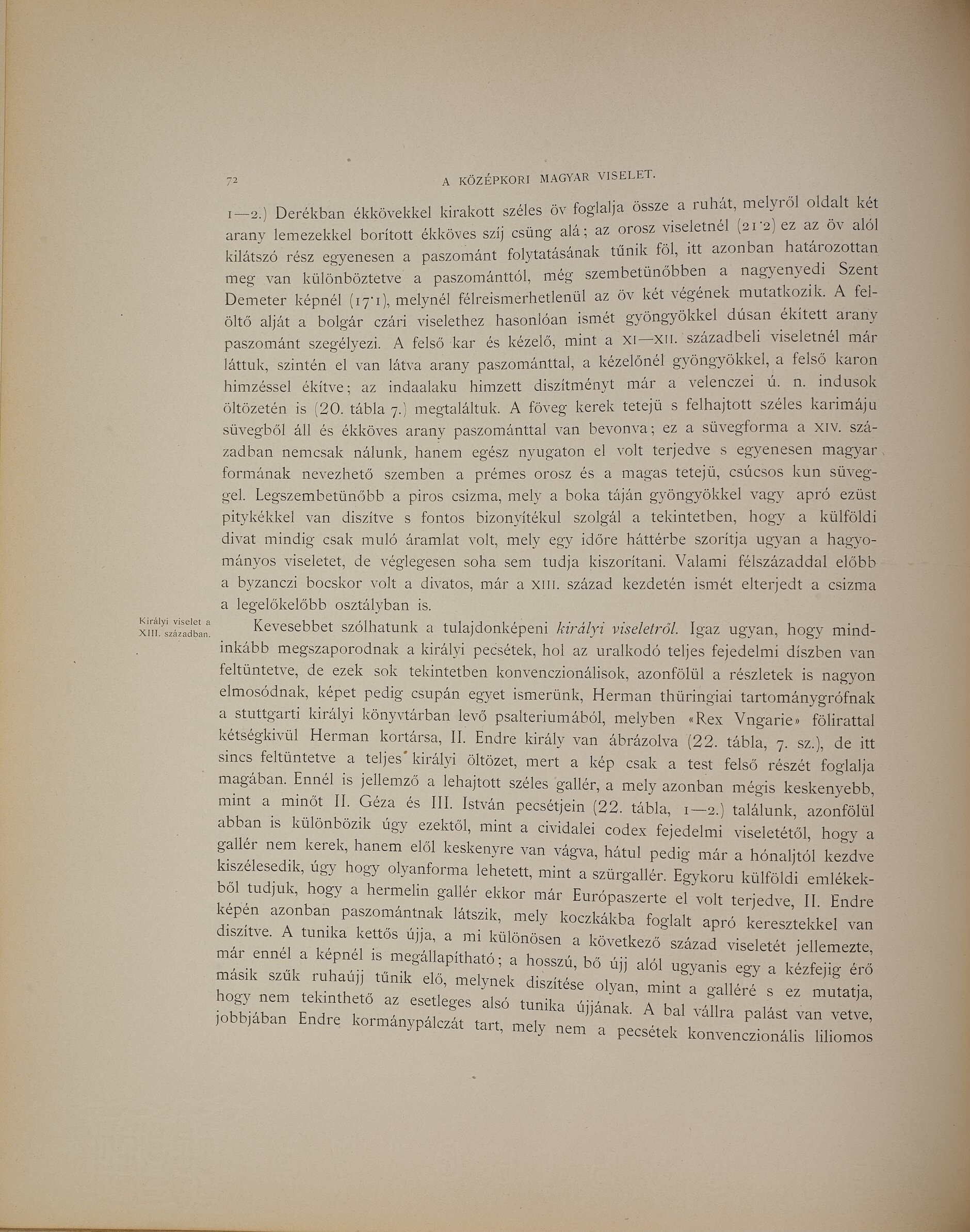 Királyi viselet a XIII. században. a A KOZEPKORI MAGYAR VISELET. ia 6 a ől oldalt ké 1—2.) Derékban ékkövekkel kirakott széles öv foglalja össze a ruhát, melyről oldalt két att ae z viseletnél (2172) ez az öv alól arany lemezekkel borított ékköves szíj csüng alá; az OTOSZ se - ) határozati 5 aszománt folytatásának tűnik föl, itt azonban hatá an J még szembetünőbben a nagyenyedi Szent az öv két végének mutatkozik. A felkilátszó rész egyenesen a p meg van különböztetve a paszománttól, Demeter képnél (171), melynél félreismérhetlenül : ae öltő alját a bolgár czari viselethez hasonlóan ismét gyöngyökkel dúsan ékített arany paszománt szegélyezi. A felső kar és kézelő, mint a XI-XII. századbeli viseletnél már láttuk, szintén el van látva arany paszománttal, a kézelőnél eyougyoli 2 felső karon himzéssel ékítve; az indaalaku himzett diszítményt már a velenczei ú. n. indusok öltözetén is (20. tábla 7.) megtaláltuk. A föveg kerek tetejü S felhajtott széles ee süvegből all és ékköves arany paszomdnttal van bevonva; ez a stivegforma a XIV. szazadban nemcsak nálunk, hanem egész nyugaton el volt terjedve s egyenesen magyar , formának nevezhető szemben a prémes orosz és a magas tetejü, csúcsos kun stiveggel. Legszembetünőbb a piros csizma, mely a boka táján gyöngyökkel vagy apró ezüst pitykékkel van diszítve s fontos bizonyítékul szolgál a tekintetben, hogy a külföldi divat mindig csak muló áramlat volt, mely egy időre háttérbe szorítja ugyan a hagyományos viseletet, de véglegesen soha sem tudja kiszorítani. Valami félszázaddal előbb a byzanczi bocskor volt a divatos, már a XIII. század kezdetén ismét elterjedt a csizma a legelőkelőbb osztályban is. Kevesebbet szólhatunk a tulajdonképeni királyi viseletról. Igaz ugyan, hogy mindinkább megszaporodnak a királyi pecsétek, hol az uralkodó teljes fejedelmi díszben van feltüntetve, de ezek sok tekintetben konvenczionálisok, azonfölül a részletek is nagyon elmosódnak, képet pedig csupán egyet ismerünk, Herman thüringiai tartománygrófnak a stuttgarti királyi könyvtárban levő psalteriumából, melyben «Rex Vngarie» fölirattal kétségkívül Herman kortársa, II. Endre király van ábrázolva (22. tabla, 7. sz.), de itt sincs feltüntetve a teljes" királyi öltözet, mert a kép csak a test felső részét foglalja magában. Ennél is jellemző a lehajtott széles gallér, a mely azonban mégis keskenyebb, mint a minőt II. Géza és III. István pecsétjein (22. tabla, 1—2.) találunk, azonfölül abban is különbözik úgy ezektől, mint a cividalei codex fejedelmi viseletétől, hogy a gallér nem kerek, hanem elől keskenyre van vágva, hátul pedig már a hónaljtól kezdve kiszélesedik, úgy hogy olyanforma lehetett, mint a szürgallér. Egykoru külföldi emlékekből tudjuk, hogy a hermelin gallér ekkor már Európaszerte el volt terjedve, II. Endre képén azonban paszomántnak látszik, mely koczkákba foglalt apró keresztekkel van diszítve. A tunika kettős újja, a mi különösen a következő század viseletét jellemezte, már ennél a képnél is megállapítható: a hosszú, bő újj alól ugyanis egy a kézfejig érő másik szűk ruhaújj tűnik elő, melynek diszítése olyan, mint a galléré s ez mutatja. hogy nem tekinthető az esetleges alsó tunika újjának. A bal eile palást van vena jobbjában Endre kormanypalczat tart, mely nem a pecsétek konvenczionális liliomos