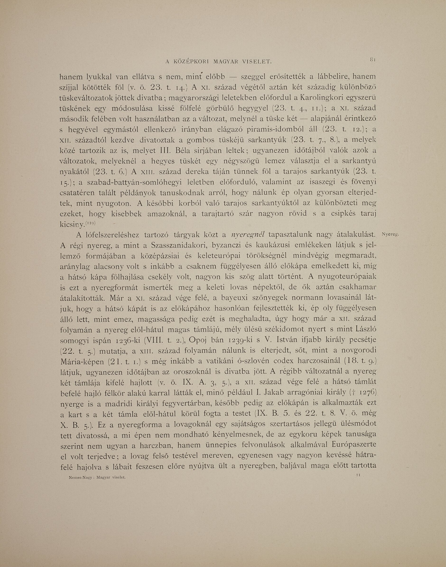A KÖZÉPKORI MAGYAR VISELET. 81 hanem lyukkal van ellátva s nem, mint előbb — szeggel erősítették a lábbelire, hanem szíjjal kötötték föl (v. 6. 23. t. 14.) A xi. század végétől aztán két századig különböző tüskeváltozatok jöttek divatba ; magyarországi leletekben előfordul a Karolingkori egyszerü tüskének egy módosulása kissé fölfelé görbülő hegygyel (23. t. 4., 11.); a XI. század második felében volt használatban az a változat, melynél a tüske két — alapjánál érintkező s hegyével egymástól ellenkező irányban elágazó piramis-idomból áll (23. t. 12.); a XII. századtól kezdve divatoztak a gombos tüskéjü sarkantyúk (23. t.-7., 8.), a melyek közé tartozik az is, melyet III. Béla sirjában leltek; ugyanezen időtájból valók azok a változatok, melyeknél a hegyes tüskét egy négyszögü lemez választja el a sarkantyú nyakától (23. t. 6.) A xi. század dereka táján tünnek föl a tarajos sarkantyúk (23. t. 15.); a szabad-battyán-somlóhegyi leletben előforduló, valamint az isaszegi és fövenyi csatatéren talált példányok tanuskodnak arról, hogy nálunk ép olyan gyorsan elterjedtek, mint nyugoton. A későbbi korból való tarajos sarkantyúktól az különbözteti meg ezeket, hogy kisebbek amazoknál, a tarajtartó szár nagyon rövid s a csipkés taraj kicsiny.9) A lófelszereléshez tartozó tárgyak közt a nyeregnél tapasztalunk nagy átalakulást. A régi nyereg, a mint a Szasszanidakori, byzanczi és kaukázusi emlékeken látjuk s jellemző formájában a középázsiai és keleteurópai törökségnél mindvégig megmaradt, aránylag alacsony volt s inkább a csaknem függélyesen álló előkápa emelkedett ki, míg a hátsó kápa fölhajlása csekély volt, nagyon kis szög alatt történt. A nyugoteurópaiak is ezt a nyeregformát ismerték meg a keleti lovas népektől, de ők aztán csakhamar átalakították. Már a xi. század vége felé, a bayeuxi szőnyegek normann lovasainál látjuk, hogy a hátsó kápát is az előkápához hasonlóan fejlesztették ki, ép oly függélyesen álló lett, mint emez, magassága pedig ezét is meghaladta, úgy hogy mar a xII. század folyamán a nyereg elől-hátul magas támlájú, mély ülésü székidomot nyert s mint László somogyi ispán 1236-ki (VIII. t. 2.) Opoj bán 1239-ki s V. István ifjabb király pecsétje (22. t. 5.) mutatja, a xi. század folyamán nálunk is elterjedt, sőt, mint a novgorodi Maria-képen (21. t. 1.) s még inkább a vatikáni ó-szlovén codex harczosainál (18. t. 9.) látjuk, ugyanezen időtájban az oroszoknál is divatba jött. A régibb változatnál a nyereg két támlája kifelé hajlott (v. 6. IX. A. 3, 5.), a xII. század vége felé a hátsó támlát befelé hajló félkör alakú karral látták el, minő például I. Jakab arragóniai király (+ 1276) nyerge is a madridi királyi fegyvertárban, később pedig az előkápán is alkalmazták ezt a kart s a két támla elől-hátul körül fogta a testet (IX. B. 5. és 22. t. 8. V. ö. még X. B. 5.). Ez a nyeregforma a lovagoknál egy sajátságos szertartásos jellegü ülésmódot tett divatossá, a mi épen nem mondható kényelmesnek, de az egykoru képek tanusága szerint nem ugyan a harczban, hanem ünnepies felvonulások alkalmával Európaszerte el volt terjedve; a lovag felső testével mereven, egyenesen vagy nagyon kevéssé hátrafelé hajolva s lábait feszesen előre nyújtva ült a nyeregben, baljával maga előtt tartotta Nemes-Nagy : Magyar viselet. II Nyereg.
